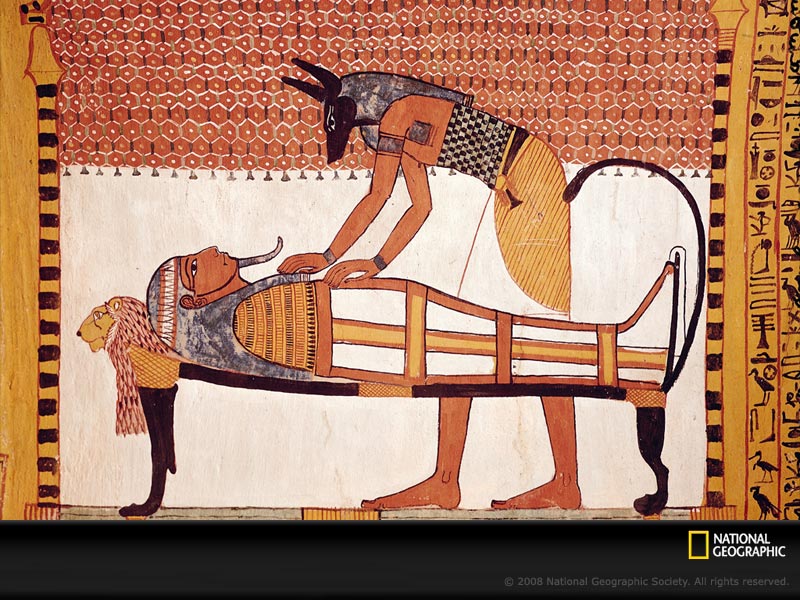 This is a mural depicting a jackal-headed Anubis, the god of the dead tending to Sennedjem in his burial chamber. Sennedjem’s tomb was found in tact in the Valley of the Kings in Egypt in 1886.